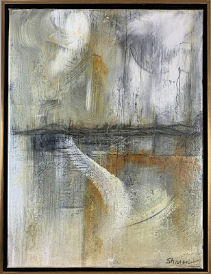 Gesso was applied heavily and randomly on the canvas before painting to add texture and interest. Three colors of paint were used, along with alcohol sprayed and paint moved to give a "ghostly" appearance.